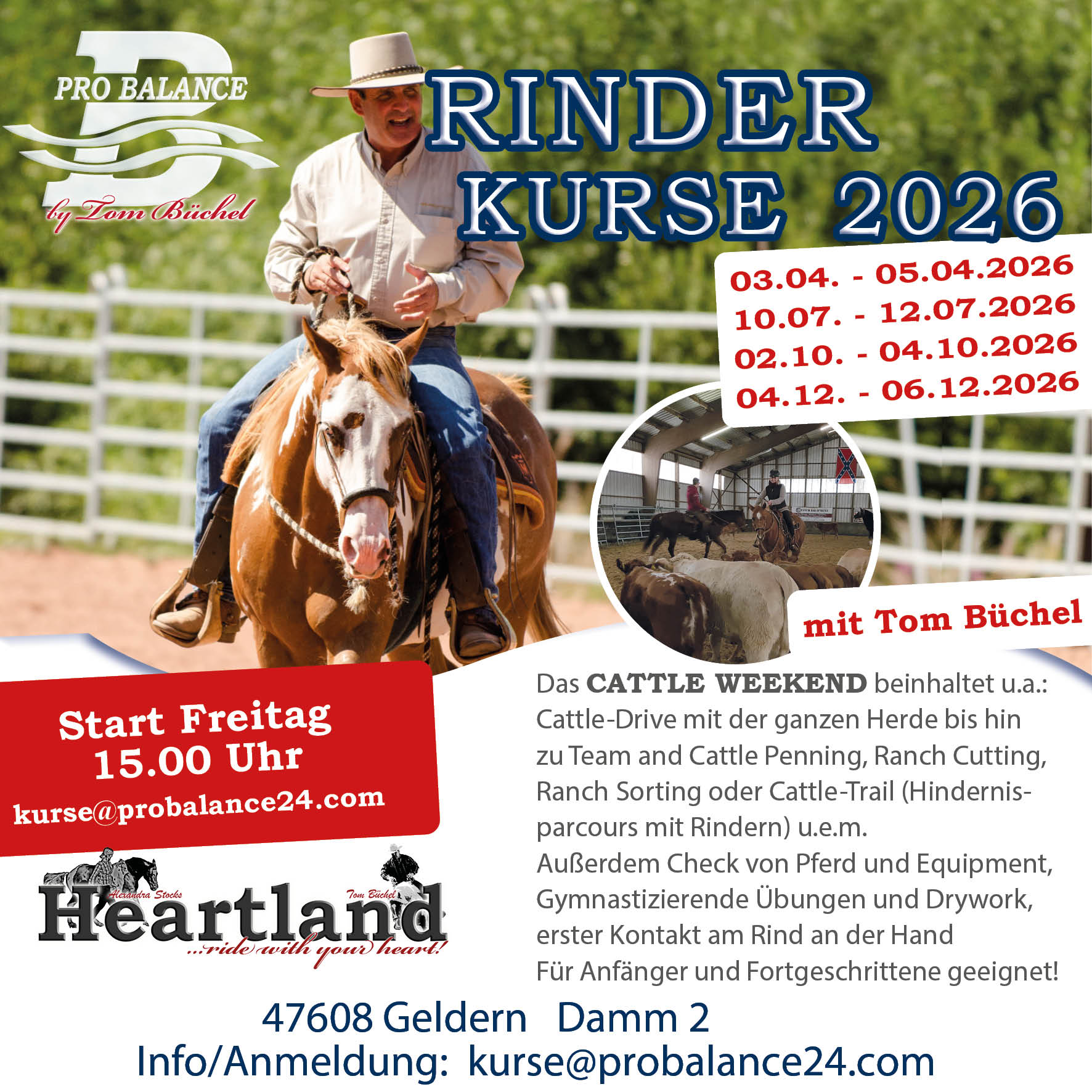 Samstag & Sonntag: Jetzt wird’s spannend! In vier weiteren Einheiten am Rind probieren wir alles aus, was Spaß macht und Sinn ergibt – von Ranch Cutting, Sorting und Team & Cattle Penning bis hin zum gezielten Aussortieren eines einzelnen Rindes. Du entscheidest, wie weit du gehst – und wir helfen dir dabei. Alles kann – nichts muss!