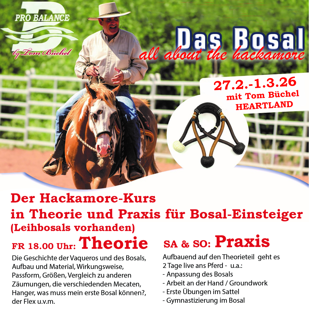 Termin: 27.02. - 01.03.2026 All About Kalifornische Hackamore – Der Bosal-Kurs für feine Reiterhände Du willst dein Pferd gebisslos reiten – aber nicht irgendwie, sondern mit echter Verbindung – mit in Stellung (vertikal und horizontal) und Biegung? Du willst verstehen, was die altkalifornischen Vaqueros wirklich gemeint haben, als sie ihre Pferde bis hin zum straight up in the bridle ritten – nicht mit Druck, sondern mit Gefühl? Dann ist dieser Kurs genau dein Einstieg in die Welt der Kalifornischen Hackamore! Ob du das Bosal bisher nur aus Büchern kennst oder einfach noch nie damit gearbeitet hast – hier lernst du die Grundlagen dieser besonderen Zäumung von