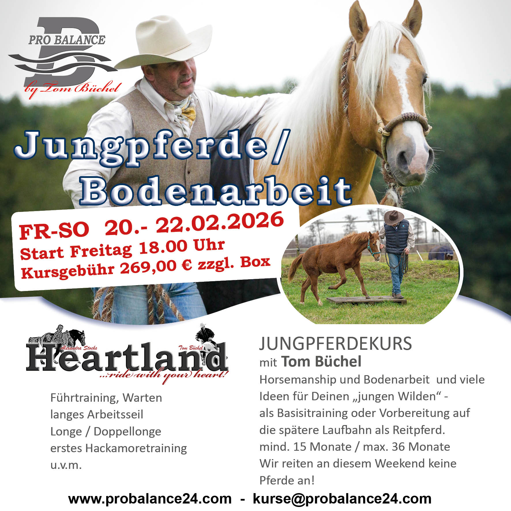 Termin: Fr-So 20. - 22.02.2026 Was Hänschen nicht lernt…. lernt Hans nimmermehr – ein Satz, den viele aus Ihrer Kindheit noch kennen. Bei Pferden ist das im Prinzip ähnlich, nur leider wird es oft vergessen oder einfach anders gesehen. Aber die Erfahrung hat gezeigt, dass man mit Fohlen und Jungpferden spielerisch Dinge üben, trainieren und erarbeiten kann (und muss), die den Alltag und später das Anreiten um einiges erleichtert – ja sogar sicherer machen! Jungpferdekurs auf HEARTLAND Die Arbeit an der Hand ist gerade für Jungpferde (15 – 36 Monate) die absolut wichtige Basis für die spätere Reitpferdekariere. Angefangen von sicherem (für Pferd und Reiter) Führen