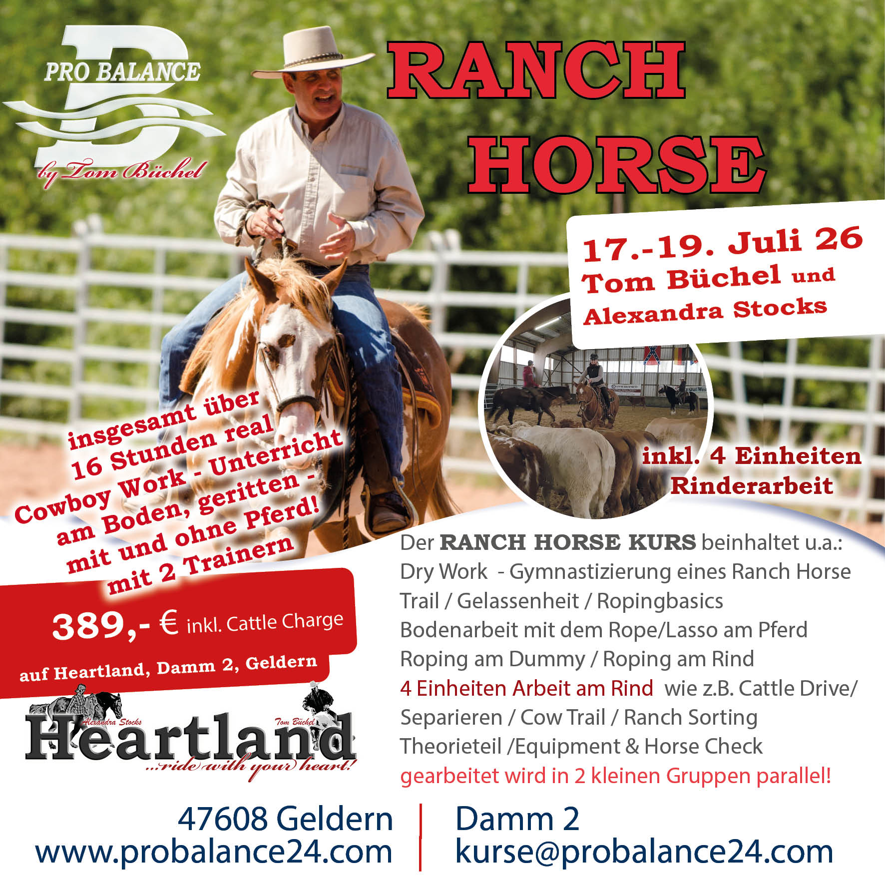 auf HEARTLAND in Geldern Termin: 17. - 19.07.2026 Ein RANCH HORSE ist ein Allrounder – Ein Alleskönner, der auf Abruf durchstartet aber auch einfach mal wartet und relaxed, mal konzentriert über Hindernisse geht um anschließend an der Kuh mit richtig Spaß zu arbeiten. Es muss unerschrocken sein, an feinen Hilfen stehen, sich leichtrittig zeigen und Spaß an der Arbeit haben. Ein Ranch Horse vereint Kraft, Ausdauer und Vielseitigkeit – der Zehnkämpfer in der Pferdewelt.Genau so werden wir in 2 kleinen Gruppen parallel (Halle, Platz, Trailpark mit 2 Trainern) trainieren - ganztägiges Fulltimeprogramm für Pferd und Reiter. Keine Angst Euer Pony bekommt genug Ruhe- und